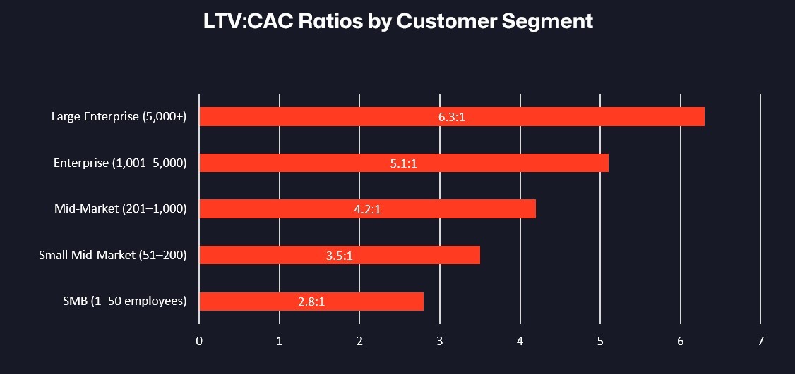 LTV:CAC ratio improves as you move upmarket—justifying higher acquisition spend on enterprise segments.